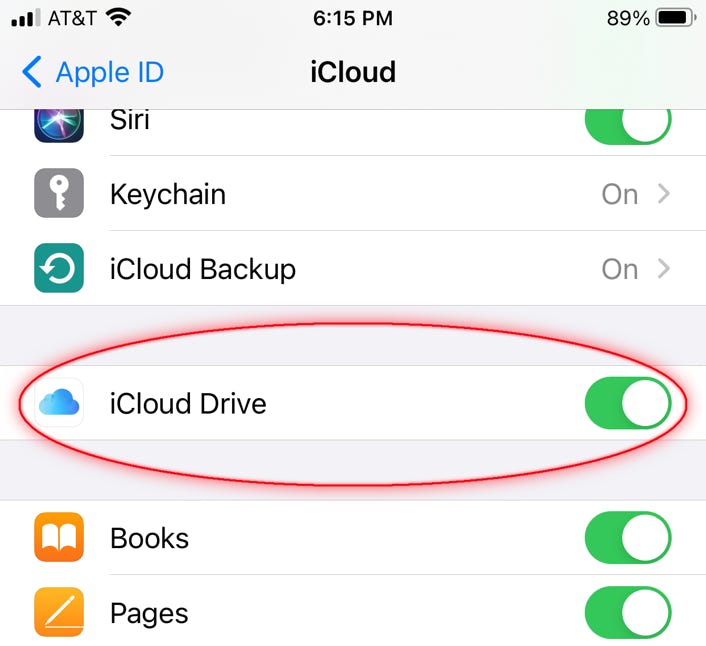 • On your iOS device, scroll back up the same list from #4 and find iCloud Drive. Confirm that it is enabled (green toggle on).