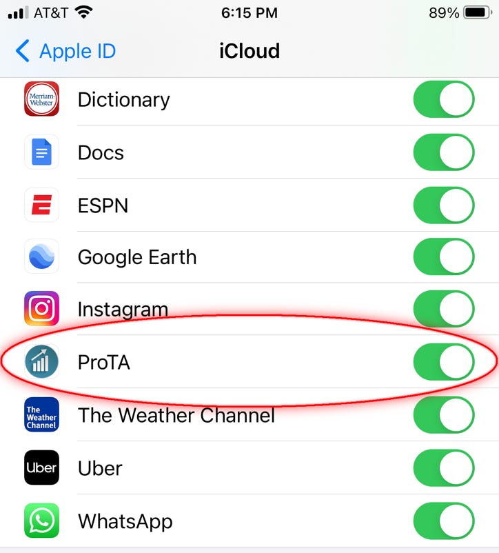 • On your iOS device, open the Settings app, then tap your name at the top. Tap iCloud then scroll down the list until you see ProTA listed. Confirm that it is enabled (green toggle on).