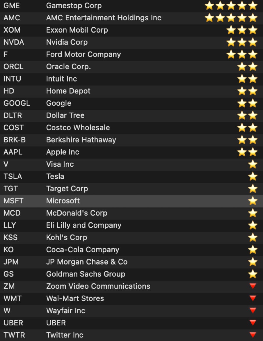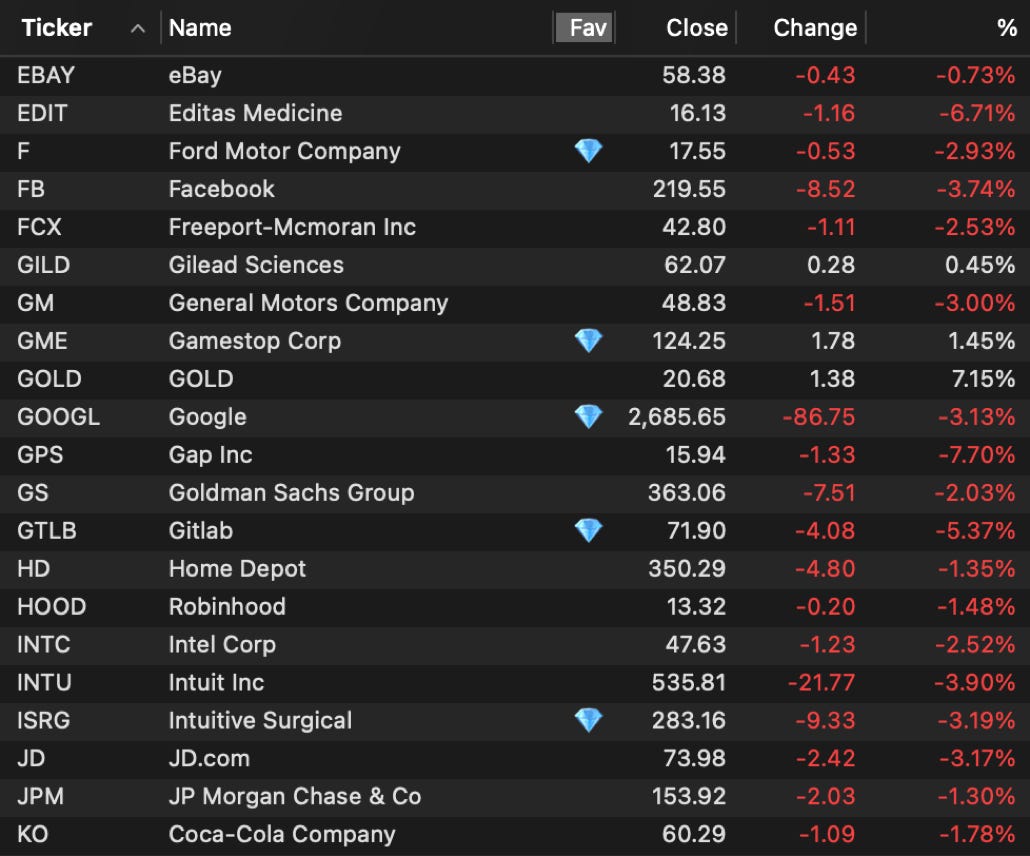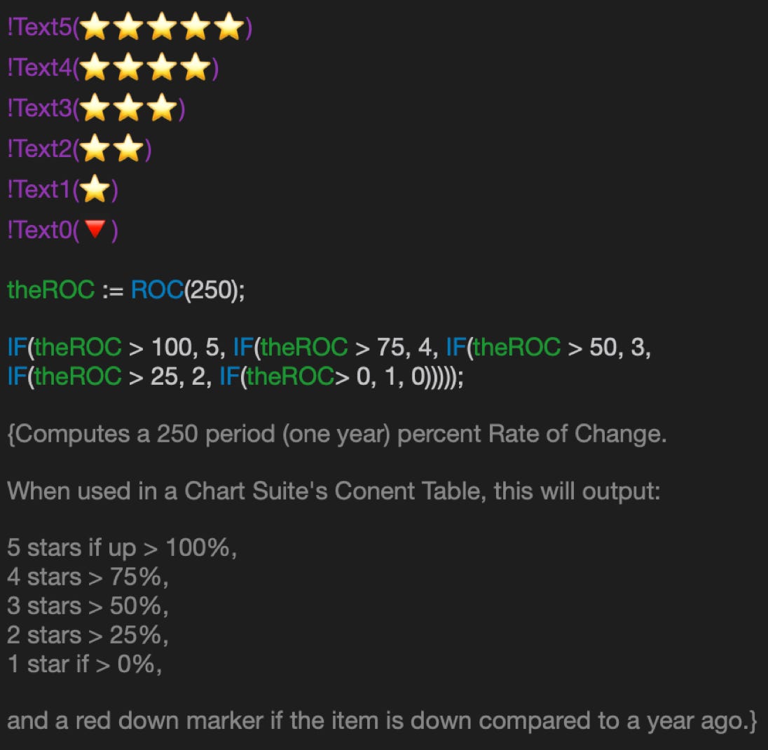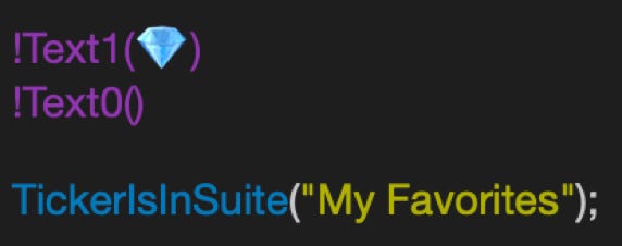 * It is now possible to test if the current ticker is present in any of your saved Custom Content Chart Suite files. For example, you may have a saved Chart Suite where you have added your 30 favorite stocks. Let’s assume this saved Chart Suite is named “My Favorites”. One use for TickerIsInSuite() is to highlight these ‘favorites’ in any chart suite’s content table with a 💎 custom indicator column as shown below: