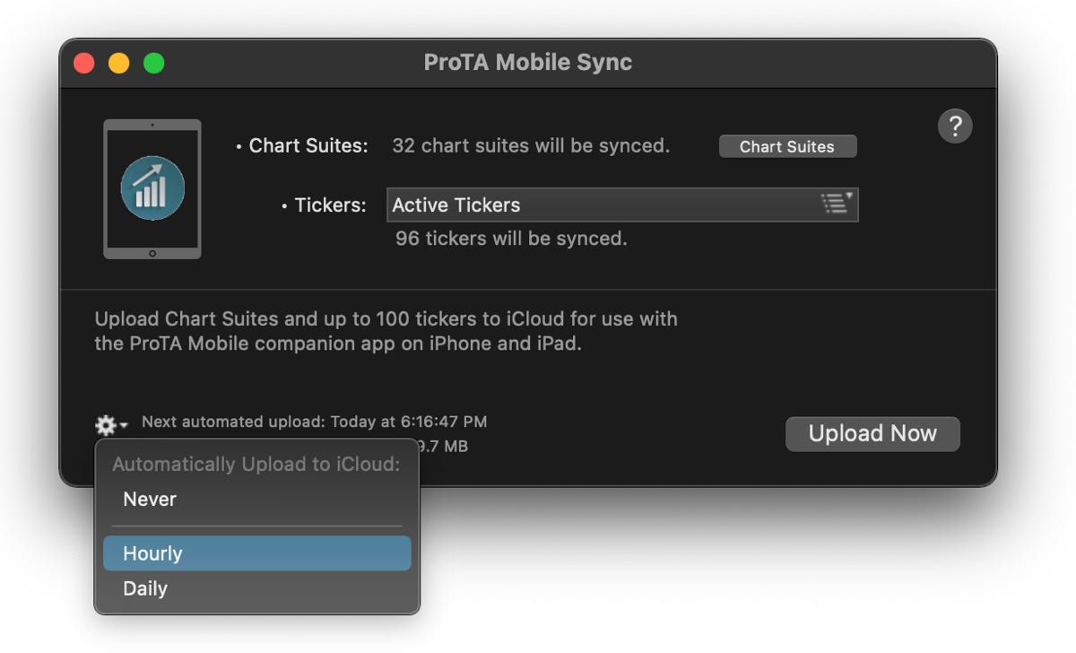* Click the new Gear widget in the ProTA Mobile Sync window to configure the timing of the automated uploads.