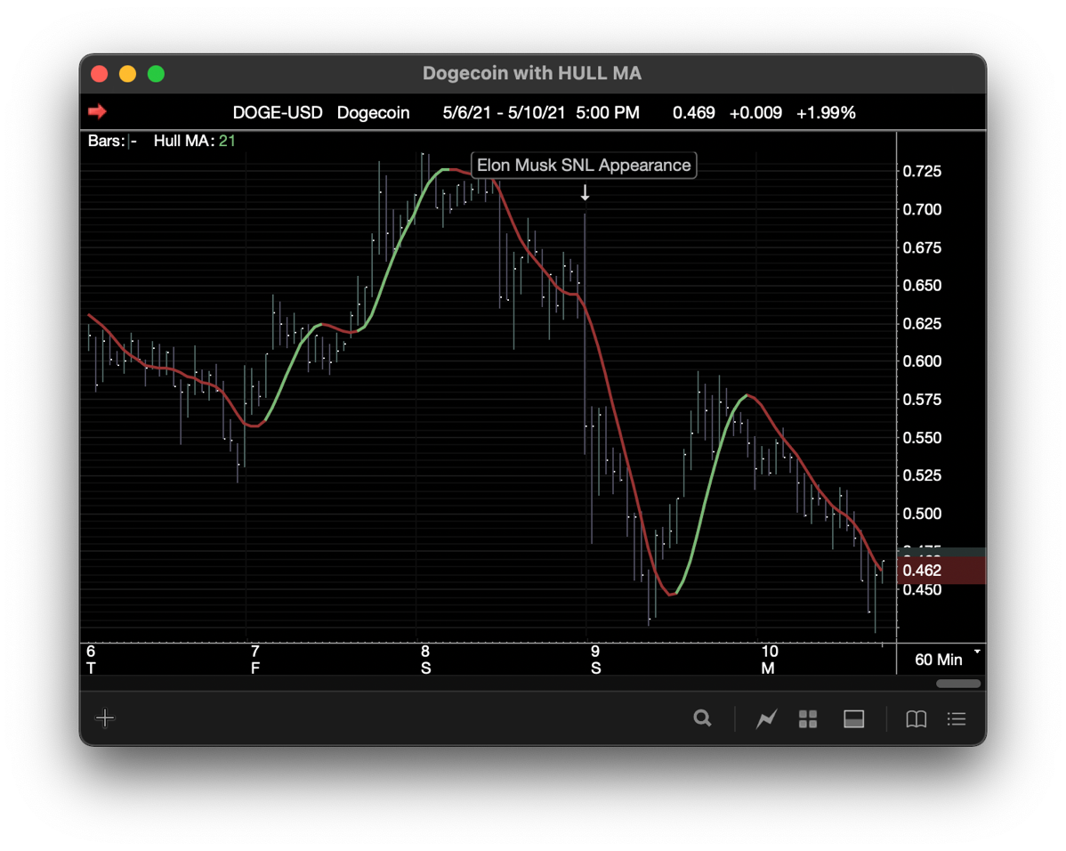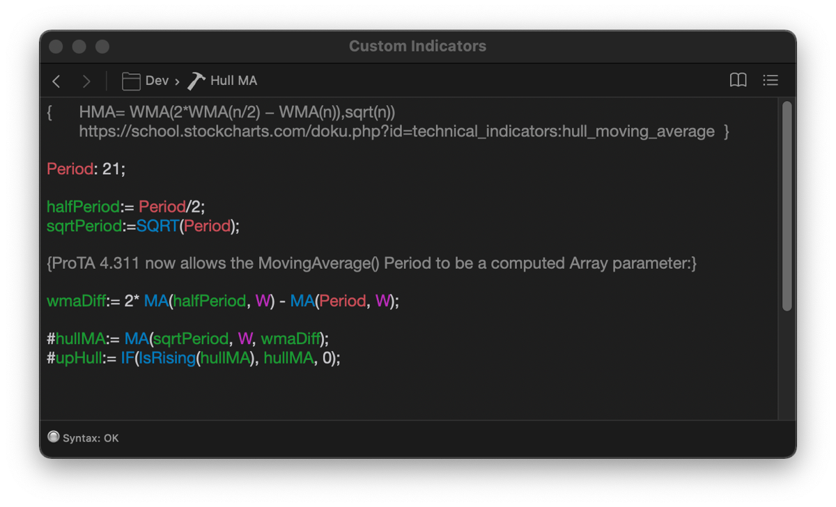 Another example uses the new variable array Period parameter of the MA() function to compute the Hull Moving Average: