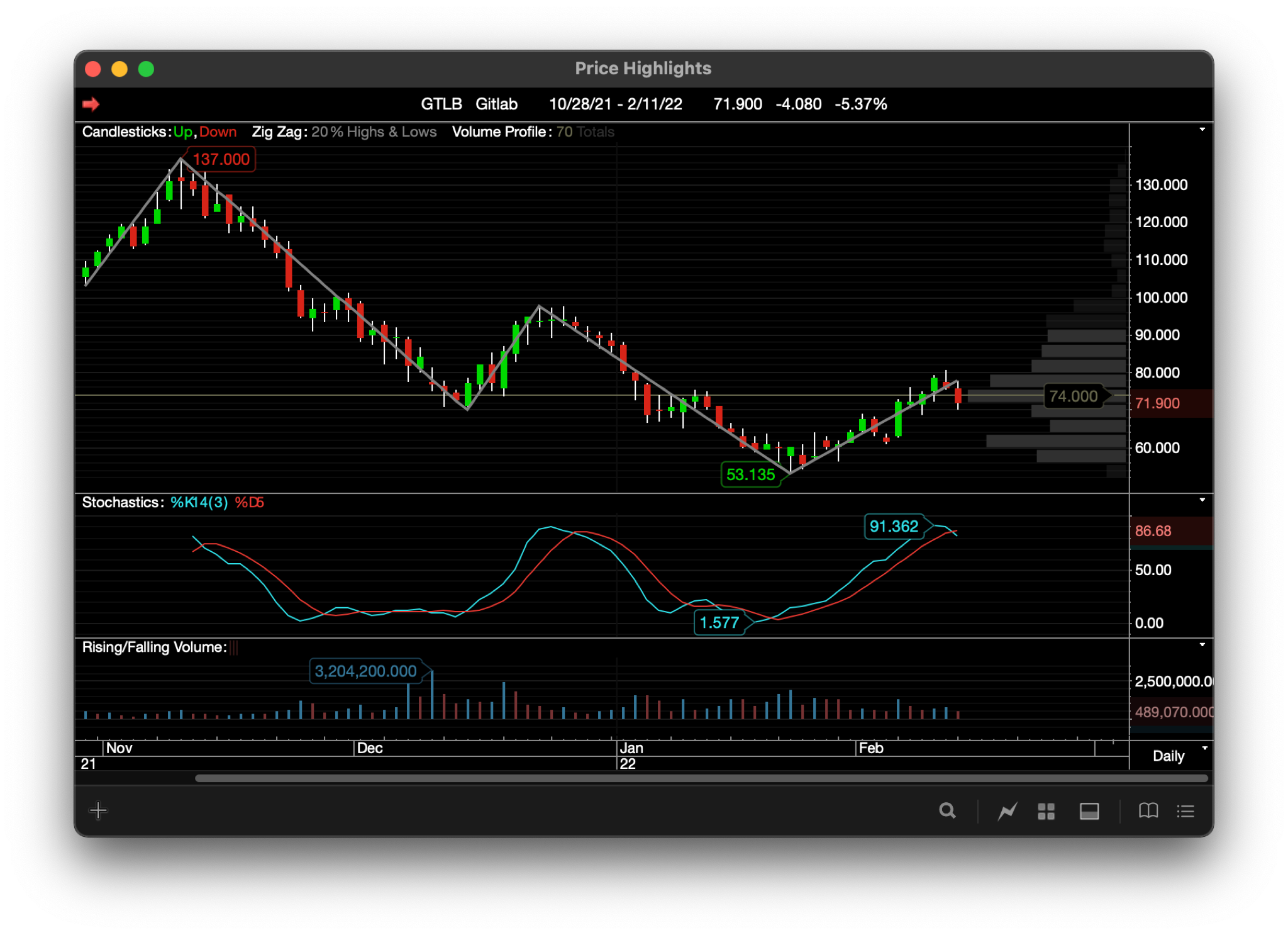 * Volume Profile displays the trading volume that has taken place at the various price levels within the chart. A unique plot style, Volume Profile renders as a horizontal histogram where each bar represents the number of shares traded at the corresponding price range.
