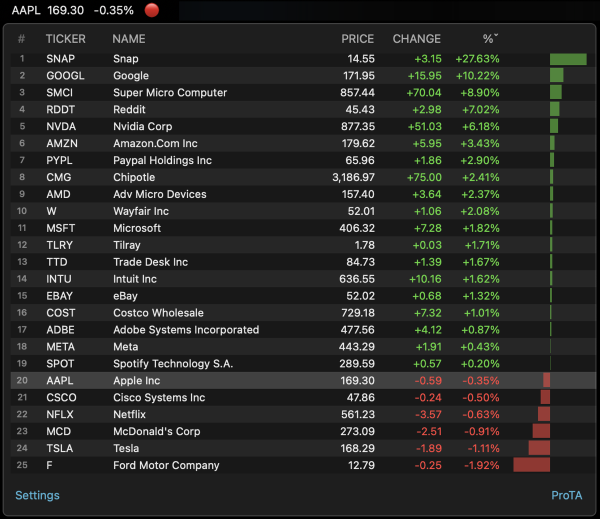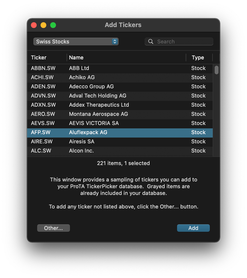 * When adding new ticker symbols to your ProTA database, the Ticker Listing popup now includes an option for Swiss Stocks.