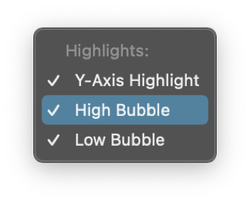 A chart with all three price highlighting options enabled: High Bubbles, Low Bubbles and Y-Axis Highlighting.