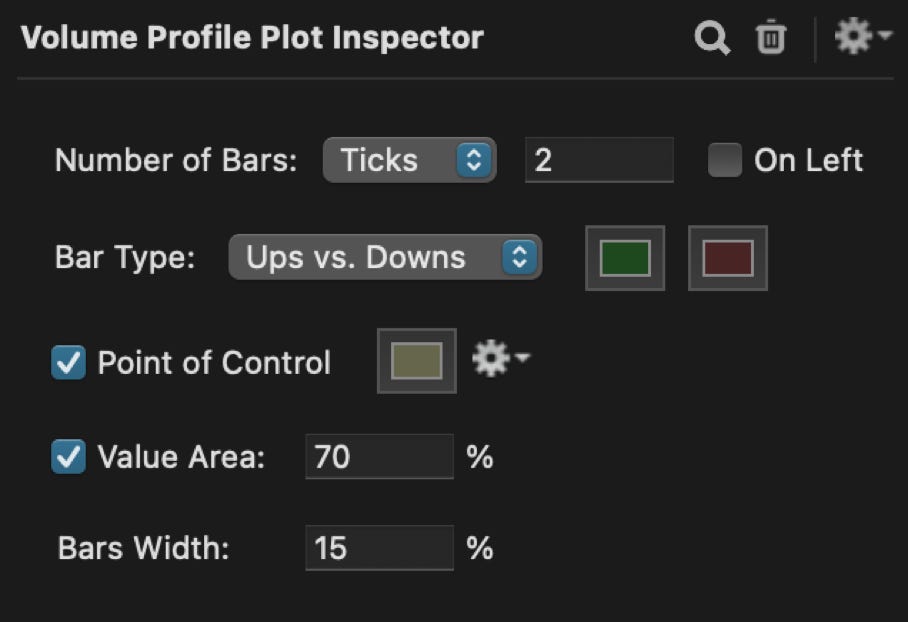 * The Value Area (VA), typically set to 70%, is the range of prices surrounding the POC such that 70% of the total volume is included in the VA. Highlighting the VA reveals where most of the trading has taken place within the visible chart.