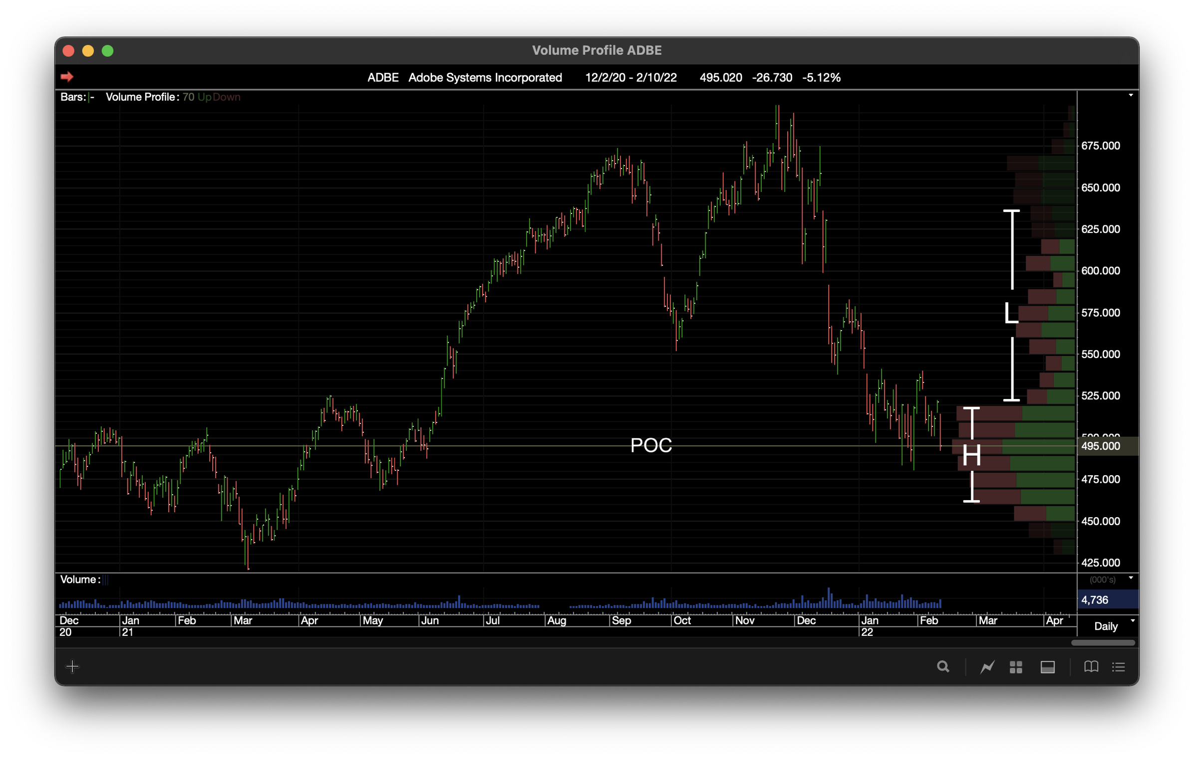 * The price at which the most volume was traded will be the longest bar and is referred to as the Point of Control (POC).