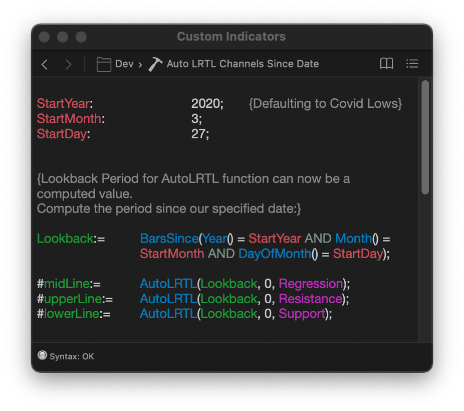 * The following ProTAscript functions now accept computed variable (Array) parameters: AutoLRTL(), AutoRL(), AutoTL(), StdDev(), MA(). This allows for some entirely new approaches in some of your existing indicators. For example, the code below now plots Linear Regression channels using a computed or specific start date of your choice: