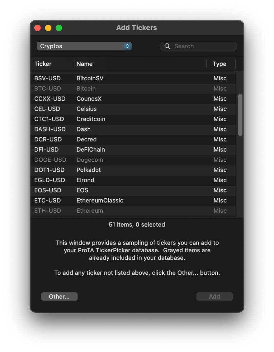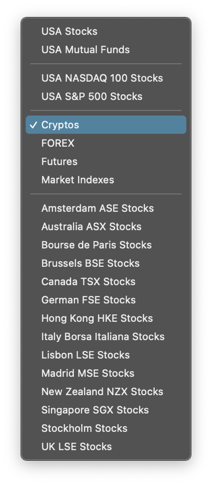 * When adding new tickers, the Ticker Lists now include new categories for Cryptos and Futures.
