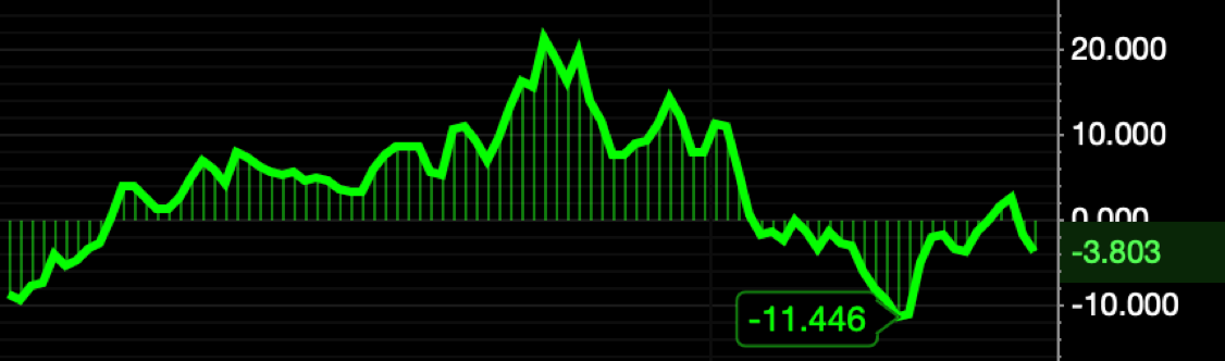Green color, fat line thickness, dropline, no adornments, Low Bubble & Y-Axis Highlight.
